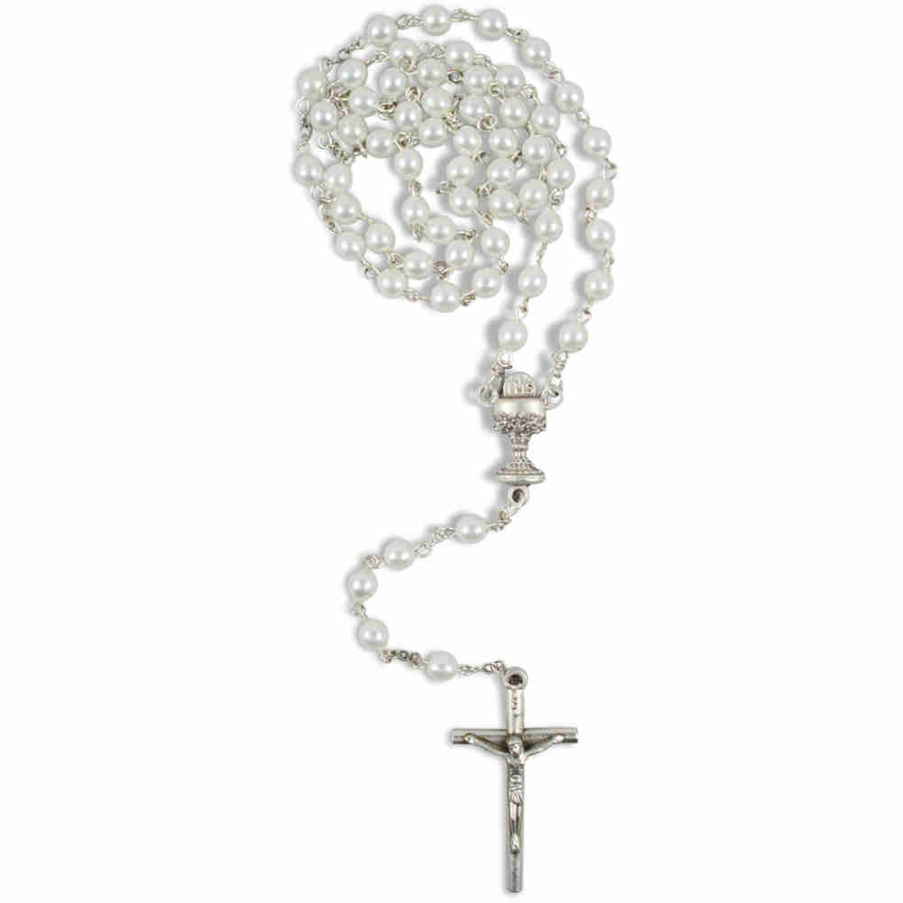 Glas Rosenkranz rosa Perle rund mit Kelch & Metallkreuz 41 cm
