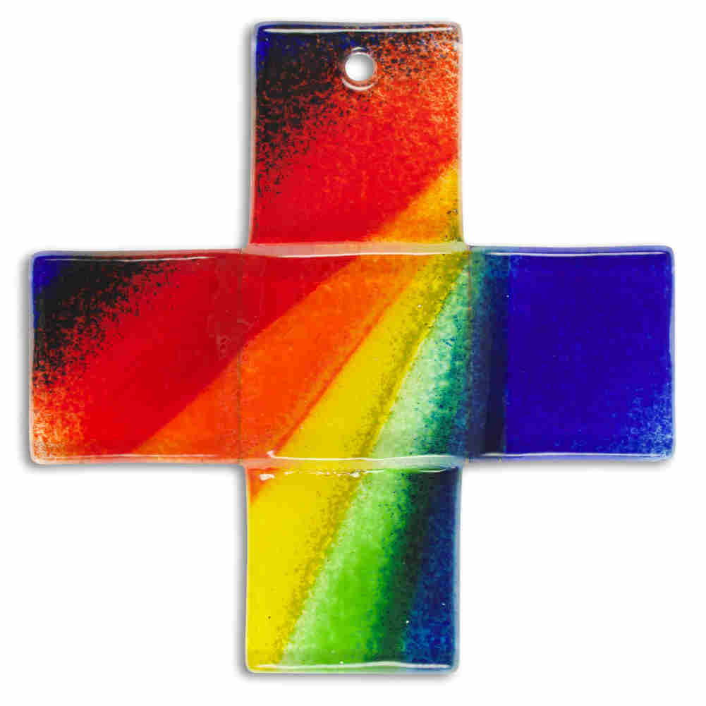 Glaskreuz blau mit Regenbogen 12 x 12 cm