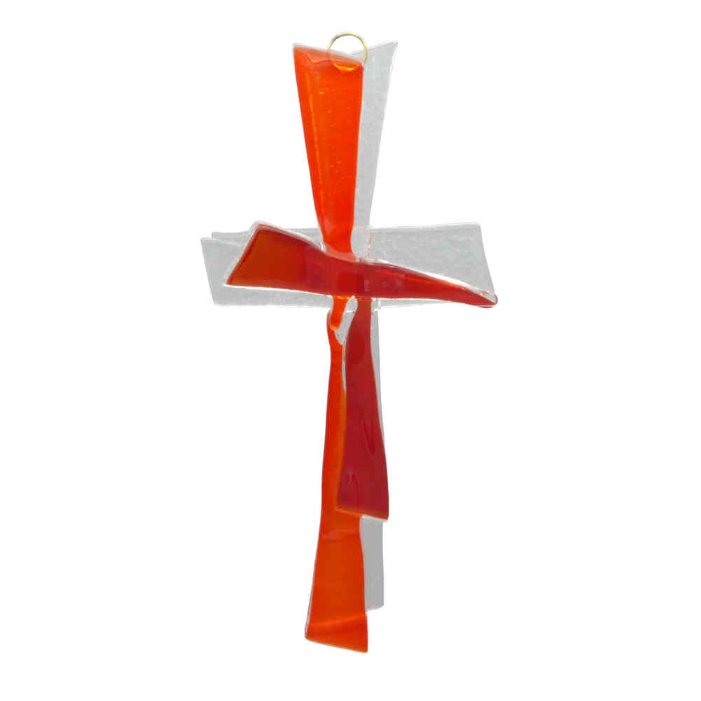 Ein modernes handgefertigtes Glaskreuz in orange und rot.