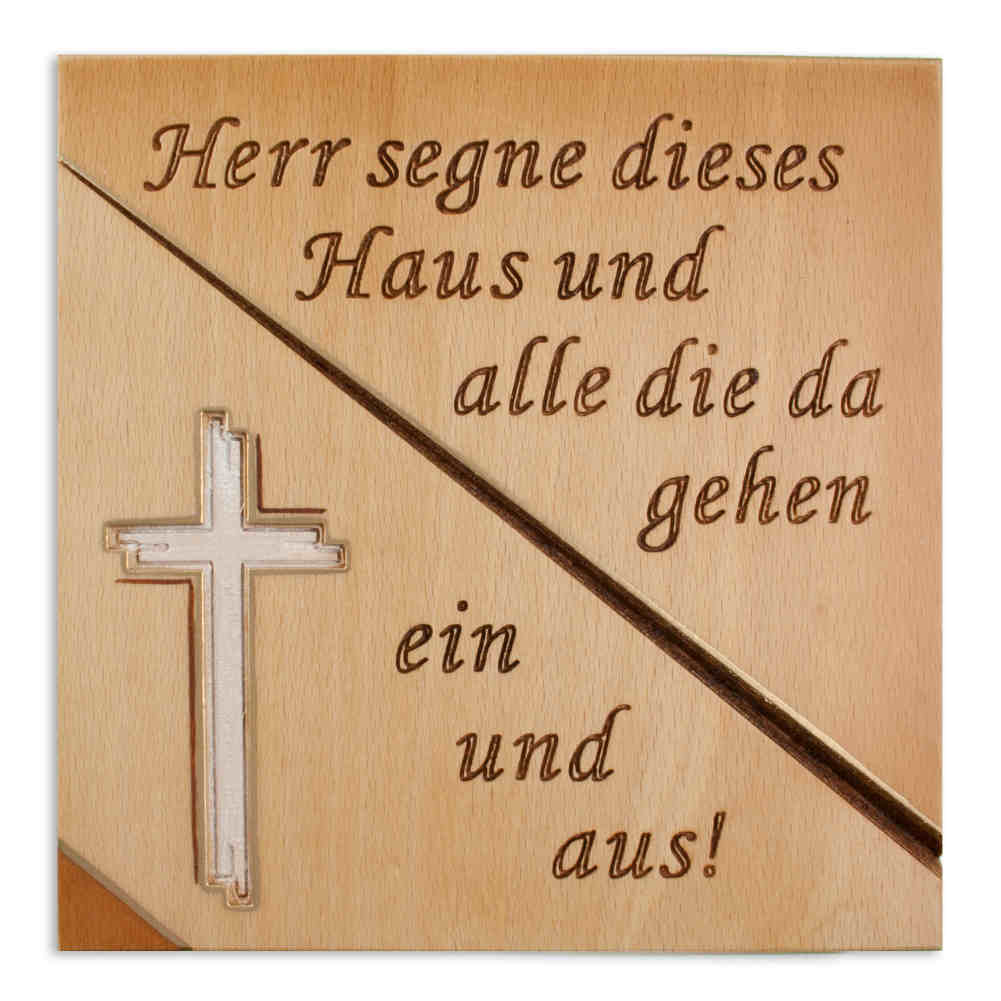 Haussegen geschnitzt - Herr segne.. Motiv Kreuz Buche 14 x 14 cm