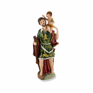 Der hl. Christophorus mit dem Jesuskind auf der Schulter ist der Schutzpatron des Verkehrs, der Fluten, Bergstraßen, Fuhrleute, Schiffer, Flößer, Fährleute, Brückenbauer, Seeleute, Pilger, Reisenden, Kraftfahrer, Chauffeure, Lastenträger, Bergleute, Zimmerleute, Hutmacher, Buchbinder, Goldschmiede, Obsthändler, Gärtner, Athleten und bewahrt vor Unglück / Krankheit - Sturm / Unwetter. Die Heiligenstatue ist aus hochwertigem Polyresin - Kunststein, aufwendig mit der Hand bemalt und nur für den Innenbereich geeignet.