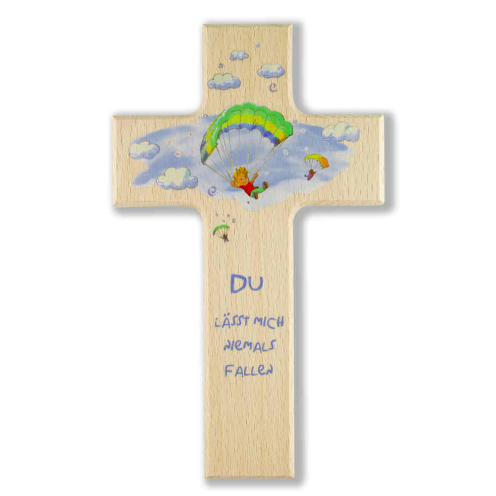 Kinderkreuz Du lässt mich niemals fallen - Kinder mit Gleitschirm Holz natur 20 x 12 cm