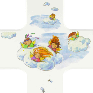 Die Illustration: Fliegende Schutzengel auf einer Wolke.