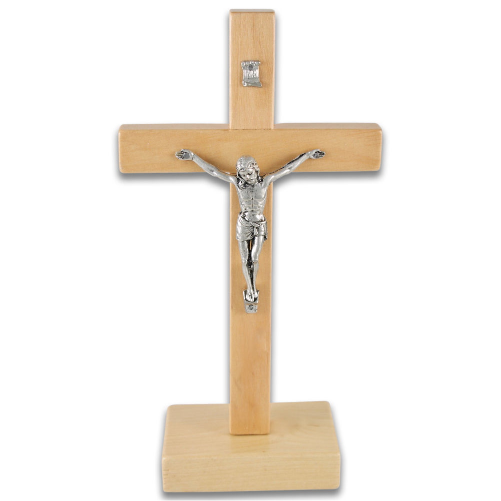 Ein Standkreuz aus lackiertem naturfarbenem Erlenholz mit einem Christuskörper aus Metall. Dieses in Handarbeit gefertigte Stehkreuz - Kruzifix ist ein schönes Geschenk für Senioren zu Hause, im Pflegeheim oder im Hospiz.