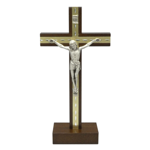 Standkreuz / Stehkreuz Holz Mahagoni mit Metallkorpus silber 17 x 8,5 cm Altarkreuz