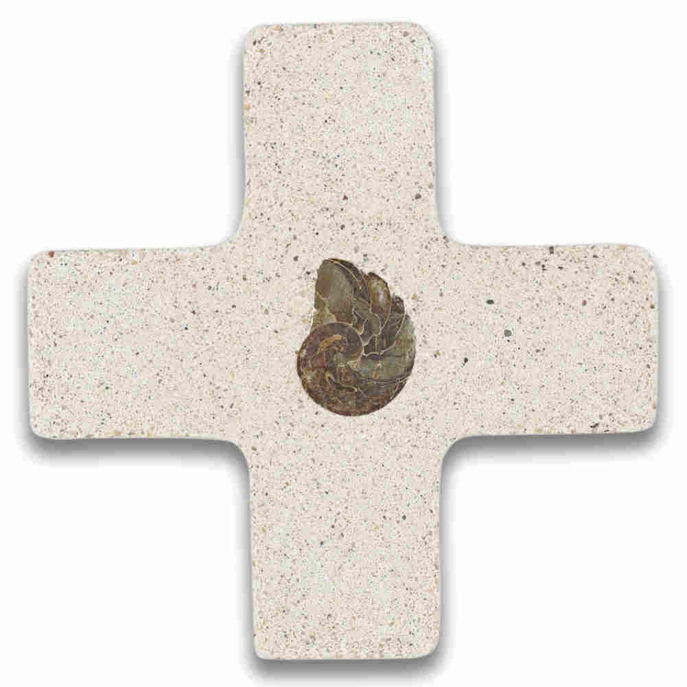 Dieses kleine, sandfarbene Steinkreuz ist mit einem Ammonit in der Mitte verziert.